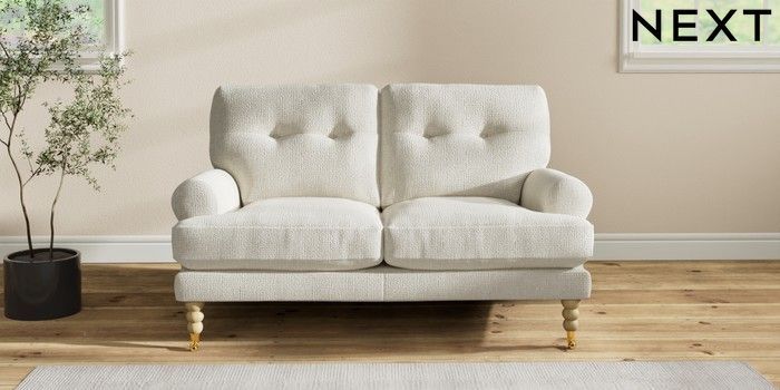 7.2.10 Erin Buttoned Back Deep Relaxed Sit 2 Seater Small Sofa Chunky Texture Oyster High Classic Turned Brass Castor - Light | Made Click here to use our website with more accessibility support, for example screen readers