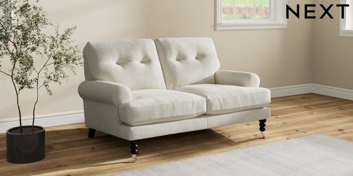 7.2.10 Erin Buttoned Back Deep Relaxed Sit 2 Seater Small Sofa Chunky Texture Oyster High Classic Turned Chrome Castor - Dark | Made Click here to use our website with more accessibility support, for example screen readers