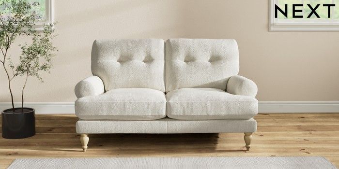 7.2.10 Erin Buttoned Back Deep Relaxed Sit 2 Seater Small Sofa Chunky Texture Oyster High Classic Turned - Light | Made Click here to use our website with more accessibility support, for example screen readers