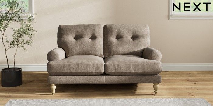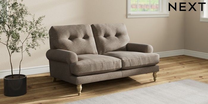 7.2.10 Erin Buttoned Back Deep Relaxed Sit 2 Seater Small Sofa Chunky Weave Dark Natural High Classic Turned - Light | Made Click here to use our website with more accessibility support, for example screen readers
