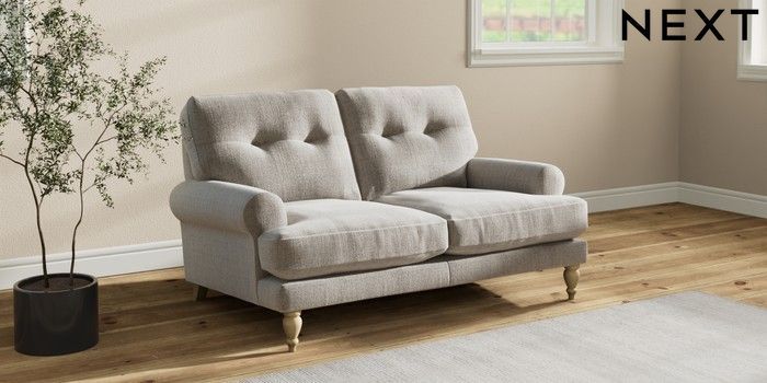7.2.10 Erin Buttoned Back Deep Relaxed Sit 2 Seater Small Sofa Chunky Weave Dove Grey High Classic Turned - Light | Made Click here to use our website with more accessibility support, for example screen readers