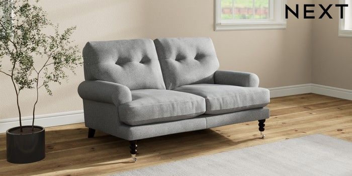 7.2.10 Erin Buttoned Back Deep Relaxed Sit 2 Seater Small Sofa Chunky Weave Mid Grey High Classic Turned Chrome Castor - Dark | Made Click here to use our website with more accessibility support, for example screen readers