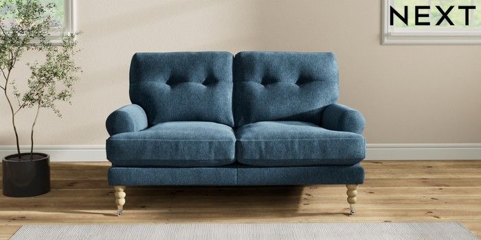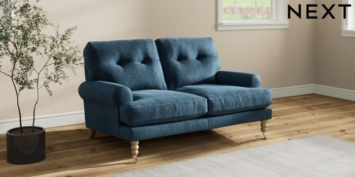 7.2.10 Erin Buttoned Back Deep Relaxed Sit 2 Seater Small Sofa Cotswold Chenille Dark Blue High Classic Turned Chrome Castor - Light | Made Click here to use our website with more accessibility support, for example screen readers