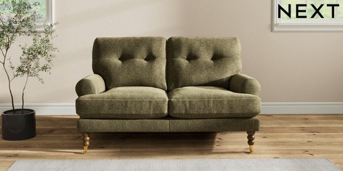 7.2.10 Erin Buttoned Back Deep Relaxed Sit 2 Seater Small Sofa Cotswold Chenille Dark Green High Classic Turned Brass Castor - Mid | Made Click here to use our website with more accessibility support, for example screen readers