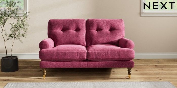 7.2.10 Erin Buttoned Back Deep Relaxed Sit 2 Seater Small Sofa Cotswold Chenille Dark Raspberry Pink High Classic Turned Brass Castor - Mid | Made Click here to use our website with more accessibility support, for example screen readers