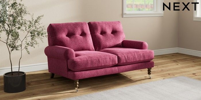 7.2.10 Erin Buttoned Back Deep Relaxed Sit 2 Seater Small Sofa Cotswold Chenille Dark Raspberry Pink High Classic Turned Chrome Castor - Mid | Made Click here to use our website with more accessibility support, for example screen readers