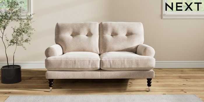 7.2.10 Erin Buttoned Back Deep Relaxed Sit 2 Seater Small Sofa Cotswold Chenille Light Natural High Classic Turned Chrome Castor - Dark | Made Click here to use our website with more accessibility support, for example screen readers