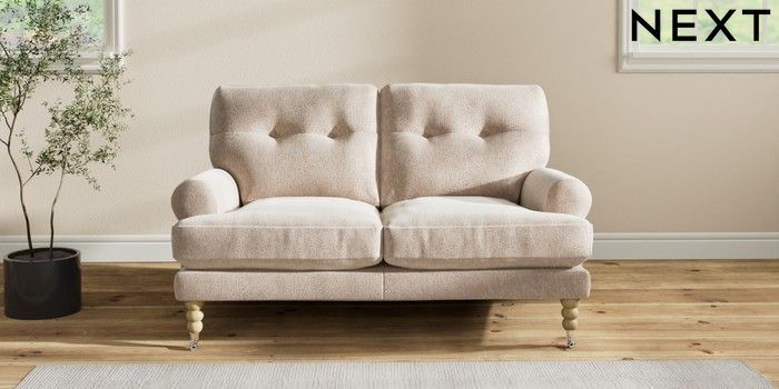 7.2.10 Erin Buttoned Back Deep Relaxed Sit 2 Seater Small Sofa Cotswold Chenille Light Natural High Classic Turned Chrome Castor - Light | Made Click here to use our website with more accessibility support, for example screen readers