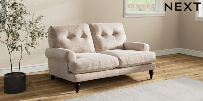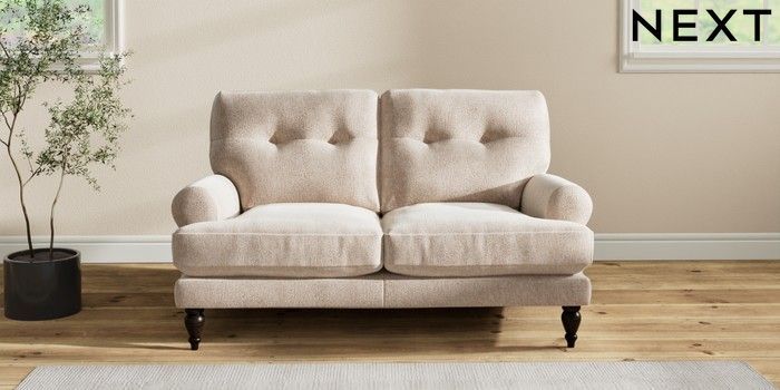 7.2.10 Erin Buttoned Back Deep Relaxed Sit 2 Seater Small Sofa Cotswold Chenille Light Natural High Classic Turned - Dark | Made Click here to use our website with more accessibility support, for example screen readers