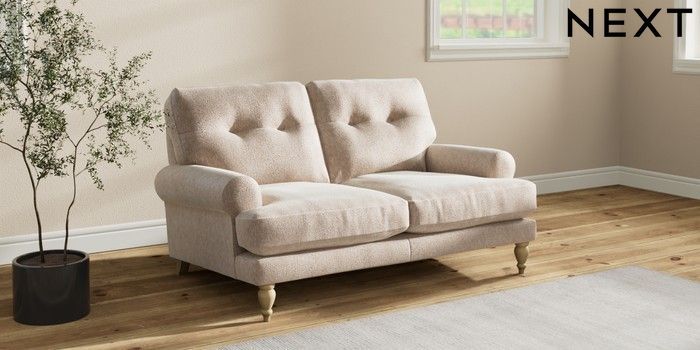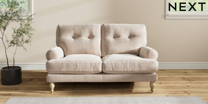 7.2.10 Erin Buttoned Back Deep Relaxed Sit 2 Seater Small Sofa Cotswold Chenille Light Natural High Classic Turned - Light | Made Click here to use our website with more accessibility support, for example screen readers