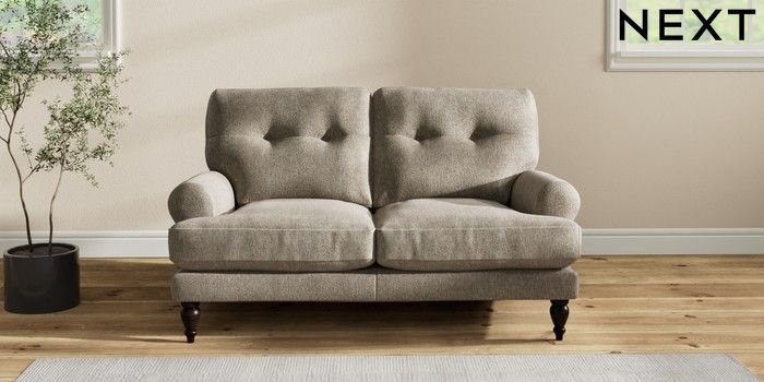 7.2.10 Erin Buttoned Back Deep Relaxed Sit 2 Seater Small Sofa Cotswold Chenille Mid Mink Brown High Classic Turned - Dark | Made Click here to use our website with more accessibility support, for example screen readers