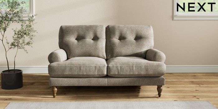 7.2.10 Erin Buttoned Back Deep Relaxed Sit 2 Seater Small Sofa Cotswold Chenille Mid Mink Brown High Classic Turned - Mid | Made Click here to use our website with more accessibility support, for example screen readers