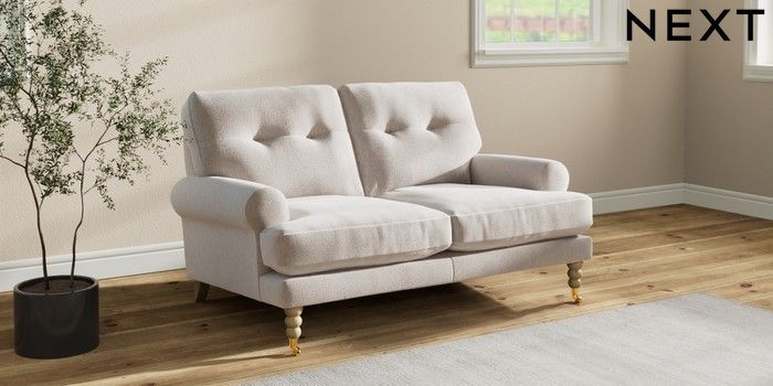 7.2.10 Erin Buttoned Back Deep Relaxed Sit 2 Seater Small Sofa Cotswold Chenille Oyster High Classic Turned Brass Castor - Light | Made Click here to use our website with more accessibility support, for example screen readers