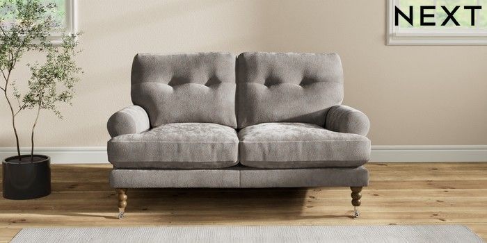 7.2.10 Erin Buttoned Back Deep Relaxed Sit 2 Seater Small Sofa Distressed Velour French Grey High Classic Turned Chrome Castor - Mid | Made Click here to use our website with more accessibility support, for example screen readers
