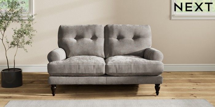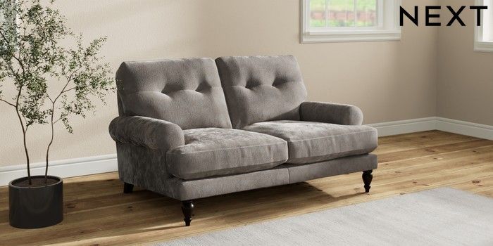 7.2.10 Erin Buttoned Back Deep Relaxed Sit 2 Seater Small Sofa Distressed Velour French Grey High Classic Turned - Dark | Made Click here to use our website with more accessibility support, for example screen readers