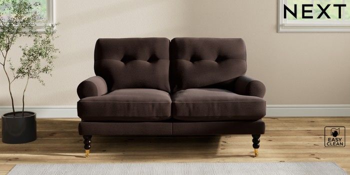 7.2.10 Erin Buttoned Back Deep Relaxed Sit 2 Seater Small Sofa Fine Chenille Easy Clean Chocolate Brown High Classic Turned Brass Castor - Dark | Made Click here to use our website with more accessibility support, for example screen readers