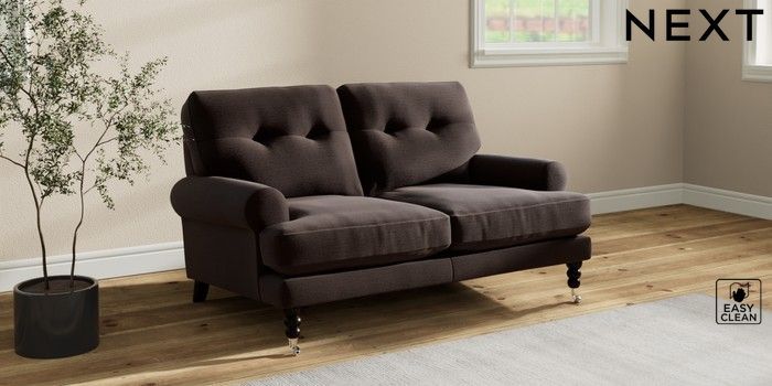 7.2.10 Erin Buttoned Back Deep Relaxed Sit 2 Seater Small Sofa Fine Chenille Easy Clean Chocolate Brown High Classic Turned Chrome Castor - Dark | Made Click here to use our website with more accessibility support, for example screen readers
