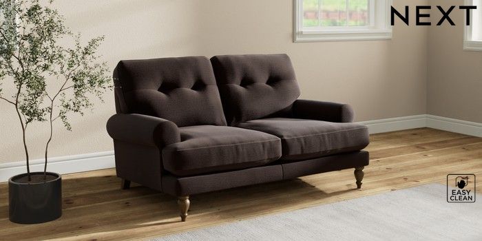 7.2.10 Erin Buttoned Back Deep Relaxed Sit 2 Seater Small Sofa Fine Chenille Easy Clean Chocolate Brown High Classic Turned - Mid | Made Click here to use our website with more accessibility support, for example screen readers