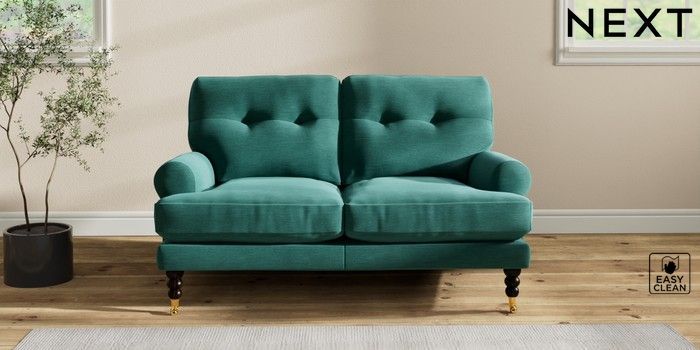 7.2.10 Erin Buttoned Back Deep Relaxed Sit 2 Seater Small Sofa Fine Chenille Easy Clean Dark Juniper Green High Classic Turned Brass Castor - Dark | Made Click here to use our website with more accessibility support, for example screen readers