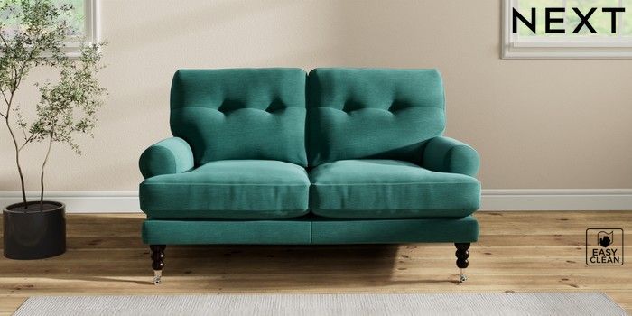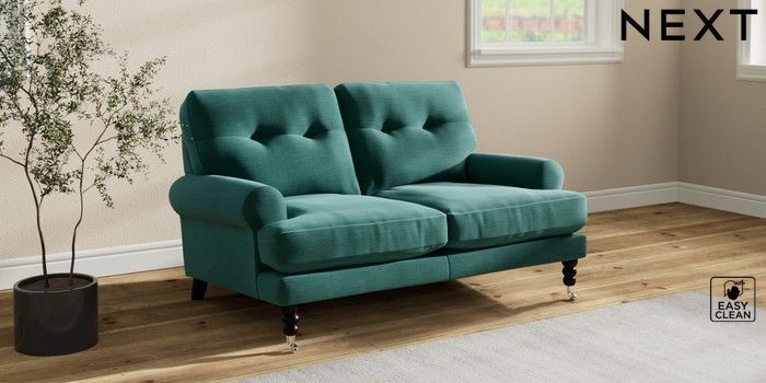 7.2.10 Erin Buttoned Back Deep Relaxed Sit 2 Seater Small Sofa Fine Chenille Easy Clean Dark Juniper Green High Classic Turned Chrome Castor - Dark | Made Click here to use our website with more accessibility support, for example screen readers