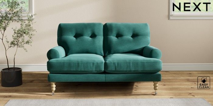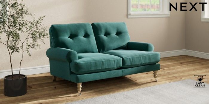 7.2.10 Erin Buttoned Back Deep Relaxed Sit 2 Seater Small Sofa Fine Chenille Easy Clean Dark Juniper Green High Classic Turned Chrome Castor - Light | Made Click here to use our website with more accessibility support, for example screen readers