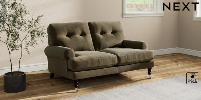 7.2.10 Erin Buttoned Back Deep Relaxed Sit 2 Seater Small Sofa Fine Chenille Easy Clean Dark Moss Green High Classic Turned Chrome Castor - Dark | Made Click here to use our website with more accessibility support, for example screen readers