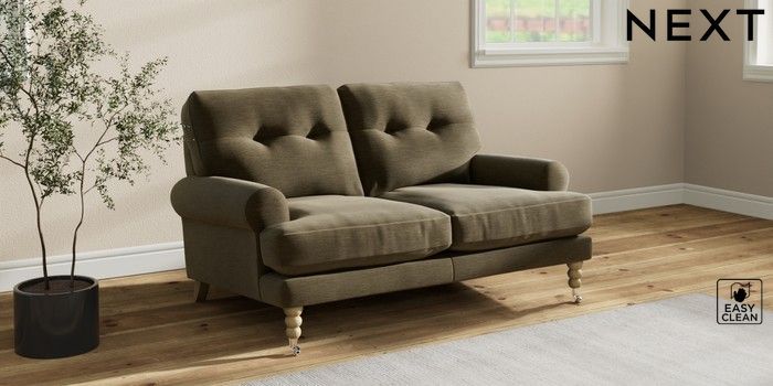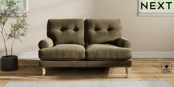 7.2.10 Erin Buttoned Back Deep Relaxed Sit 2 Seater Small Sofa Fine Chenille Easy Clean Dark Moss Green High Classic Turned Chrome Castor - Light | Made Click here to use our website with more accessibility support, for example screen readers