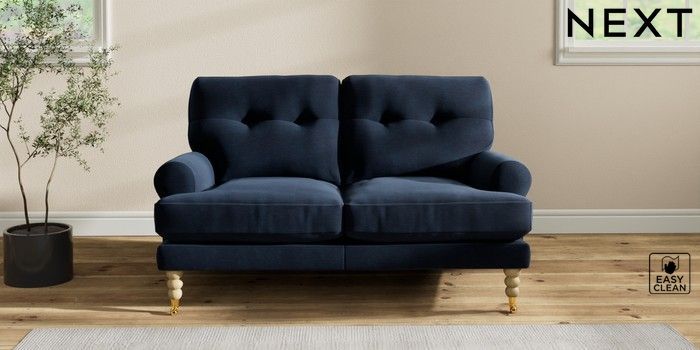 7.2.10 Erin Buttoned Back Deep Relaxed Sit 2 Seater Small Sofa Fine Chenille Easy Clean Dark Navy Blue High Classic Turned Brass Castor - Light | Made Click here to use our website with more accessibility support, for example screen readers