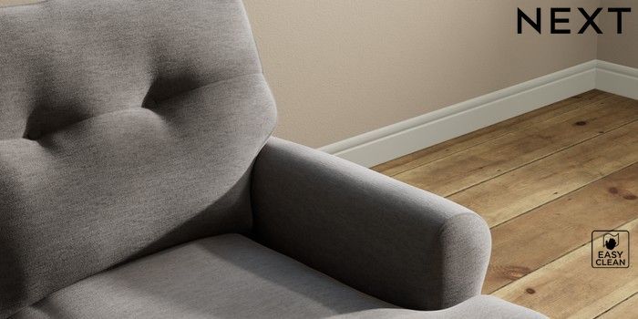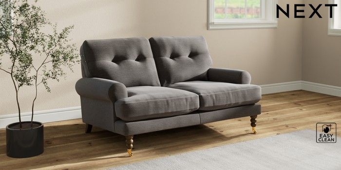 7.2.10 Erin Buttoned Back Deep Relaxed Sit 2 Seater Small Sofa Fine Chenille Easy Clean Dark Smoke Grey High Classic Turned Brass Castor - Mid | Made Click here to use our website with more accessibility support, for example screen readers