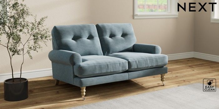 7.2.10 Erin Buttoned Back Deep Relaxed Sit 2 Seater Small Sofa Fine Chenille Easy Clean Mid Blue High Classic Turned Chrome Castor - Light | Made Click here to use our website with more accessibility support, for example screen readers