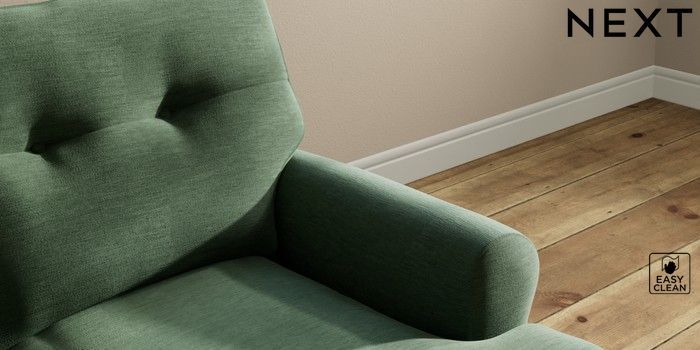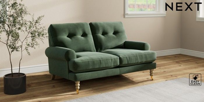 7.2.10 Erin Buttoned Back Deep Relaxed Sit 2 Seater Small Sofa Fine Chenille Easy Clean Mid Khaki Green High Classic Turned Brass Castor - Light | Made Click here to use our website with more accessibility support, for example screen readers