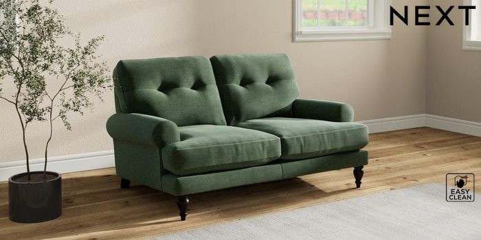 7.2.10 Erin Buttoned Back Deep Relaxed Sit 2 Seater Small Sofa Fine Chenille Easy Clean Mid Khaki Green High Classic Turned - Dark | Made Click here to use our website with more accessibility support, for example screen readers