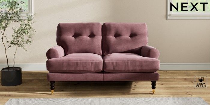 7.2.10 Erin Buttoned Back Deep Relaxed Sit 2 Seater Small Sofa Fine Chenille Easy Clean Mid Mulberry Purple High Classic Turned Brass Castor - Dark | Made Click here to use our website with more accessibility support, for example screen readers