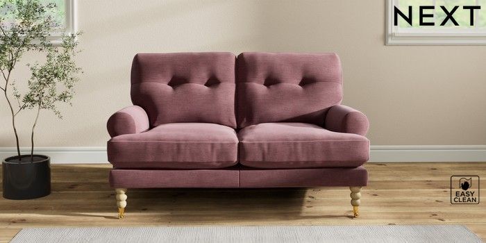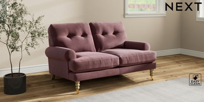 7.2.10 Erin Buttoned Back Deep Relaxed Sit 2 Seater Small Sofa Fine Chenille Easy Clean Mid Mulberry Purple High Classic Turned Brass Castor - Light | Made Click here to use our website with more accessibility support, for example screen readers