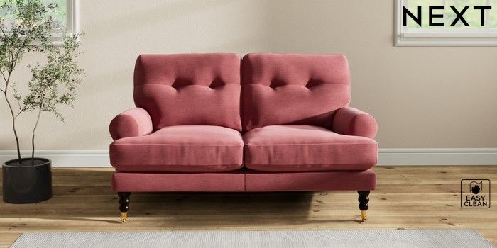 7.2.10 Erin Buttoned Back Deep Relaxed Sit 2 Seater Small Sofa Fine Chenille Easy Clean Mid Pink High Classic Turned Brass Castor - Dark | Made Click here to use our website with more accessibility support, for example screen readers