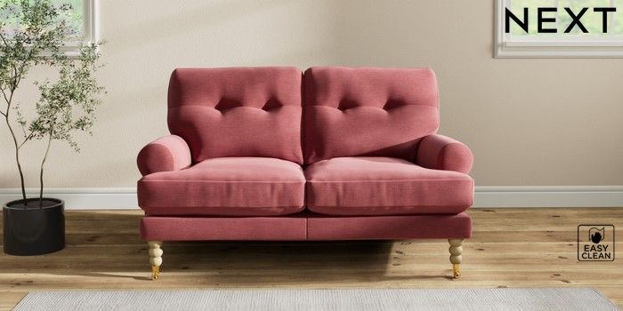 7.2.10 Erin Buttoned Back Deep Relaxed Sit 2 Seater Small Sofa Fine Chenille Easy Clean Mid Pink High Classic Turned Brass Castor - Light | Made Click here to use our website with more accessibility support, for example screen readers