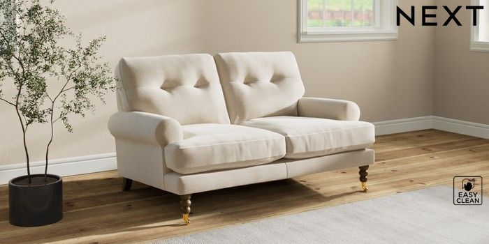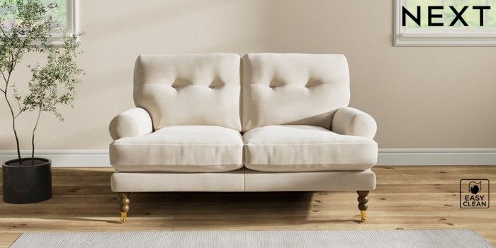 7.2.10 Erin Buttoned Back Deep Relaxed Sit 2 Seater Small Sofa Fine Chenille Easy Clean Oyster High Classic Turned Brass Castor - Mid | Made Click here to use our website with more accessibility support, for example screen readers