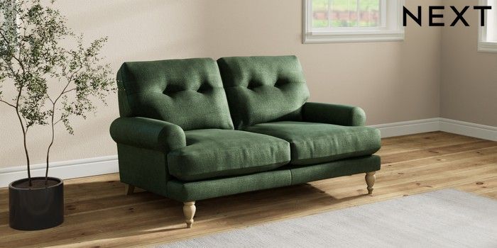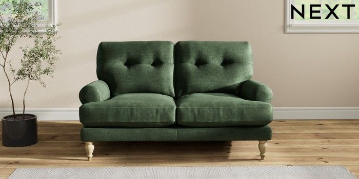 7.2.10 Erin Buttoned Back Deep Relaxed Sit 2 Seater Small Sofa Luxe Chenille Dark Green High Classic Turned - Light | Made Click here to use our website with more accessibility support, for example screen readers