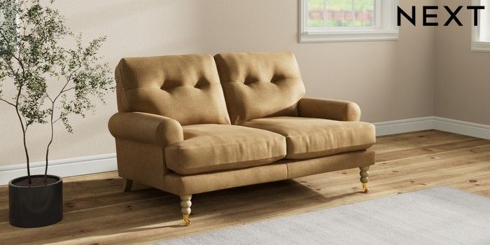 7.2.10 Erin Buttoned Back Deep Relaxed Sit 2 Seater Small Sofa Luxe Chenille Honey Yellow High Classic Turned Brass Castor - Light | Made Click here to use our website with more accessibility support, for example screen readers