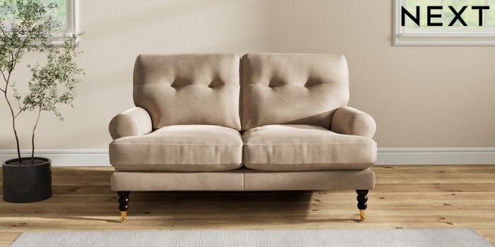 7.2.10 Erin Buttoned Back Deep Relaxed Sit 2 Seater Small Sofa Luxe Chenille Mid Camel Beige High Classic Turned Brass Castor - Dark | Made Click here to use our website with more accessibility support, for example screen readers