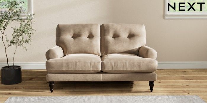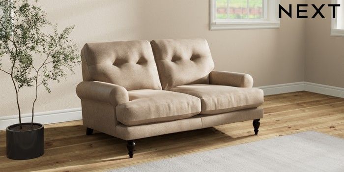 7.2.10 Erin Buttoned Back Deep Relaxed Sit 2 Seater Small Sofa Luxe Chenille Mid Camel Beige High Classic Turned - Dark | Made Click here to use our website with more accessibility support, for example screen readers