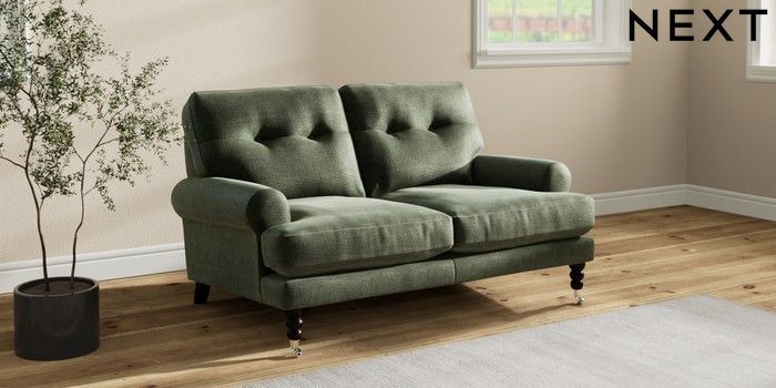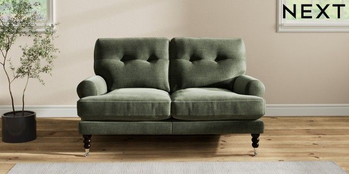 7.2.10 Erin Buttoned Back Deep Relaxed Sit 2 Seater Small Sofa Luxe Chenille Mid Green High Classic Turned Chrome Castor - Dark | Made Click here to use our website with more accessibility support, for example screen readers
