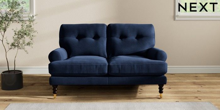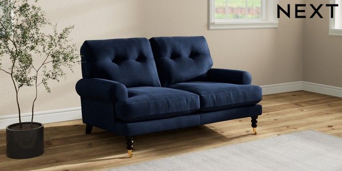7.2.10 Erin Buttoned Back Deep Relaxed Sit 2 Seater Small Sofa Luxe Chenille Navy Blue High Classic Turned Brass Castor - Dark | Made Click here to use our website with more accessibility support, for example screen readers