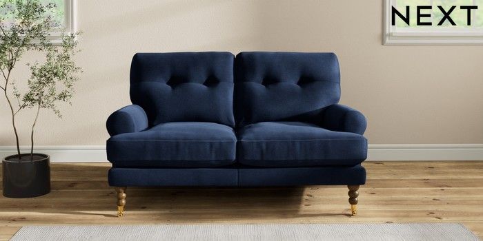 7.2.10 Erin Buttoned Back Deep Relaxed Sit 2 Seater Small Sofa Luxe Chenille Navy Blue High Classic Turned Brass Castor - Mid | Made Click here to use our website with more accessibility support, for example screen readers