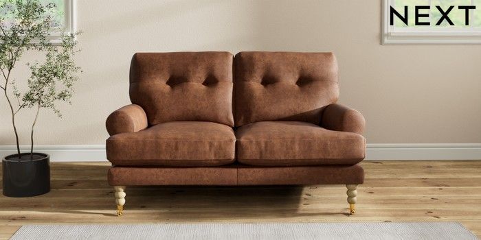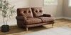 7.2.10 Erin Buttoned Back Deep Relaxed Sit 2 Seater Small Sofa Monza Faux Leather Easy Clean Chestnut Brown High Classic Turned Brass Castor - Light | Made Click here to use our website with more accessibility support, for example screen readers