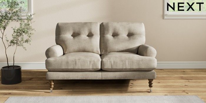7.2.10 Erin Buttoned Back Deep Relaxed Sit 2 Seater Small Sofa Monza Faux Leather Easy Clean Mink Brown High Classic Turned Chrome Castor - Mid | Made Click here to use our website with more accessibility support, for example screen readers