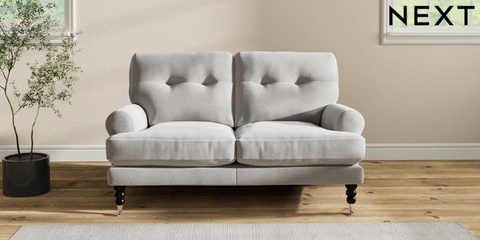7.2.10 Erin Buttoned Back Deep Relaxed Sit 2 Seater Small Sofa Natural Mix Light Grey High Classic Turned Chrome Castor - Dark | Made Click here to use our website with more accessibility support, for example screen readers