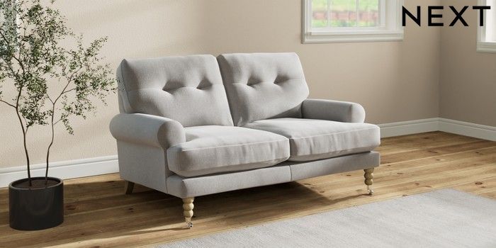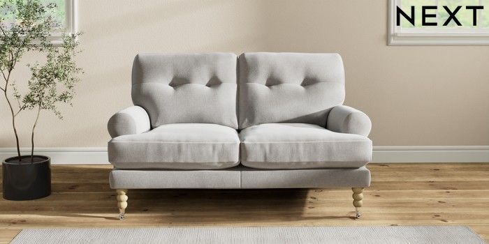 7.2.10 Erin Buttoned Back Deep Relaxed Sit 2 Seater Small Sofa Natural Mix Light Grey High Classic Turned Chrome Castor - Light | Made Click here to use our website with more accessibility support, for example screen readers