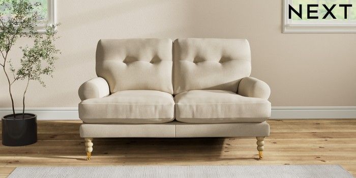 7.2.10 Erin Buttoned Back Deep Relaxed Sit 2 Seater Small Sofa Natural Mix Light Natural High Classic Turned Brass Castor - Light | Made Click here to use our website with more accessibility support, for example screen readers