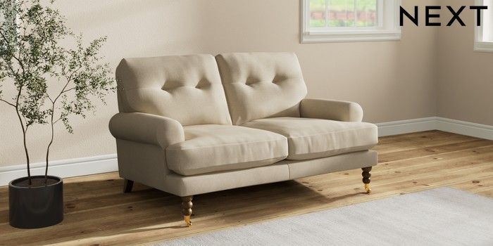 7.2.10 Erin Buttoned Back Deep Relaxed Sit 2 Seater Small Sofa Natural Mix Light Natural High Classic Turned Brass Castor - Mid | Made Click here to use our website with more accessibility support, for example screen readers